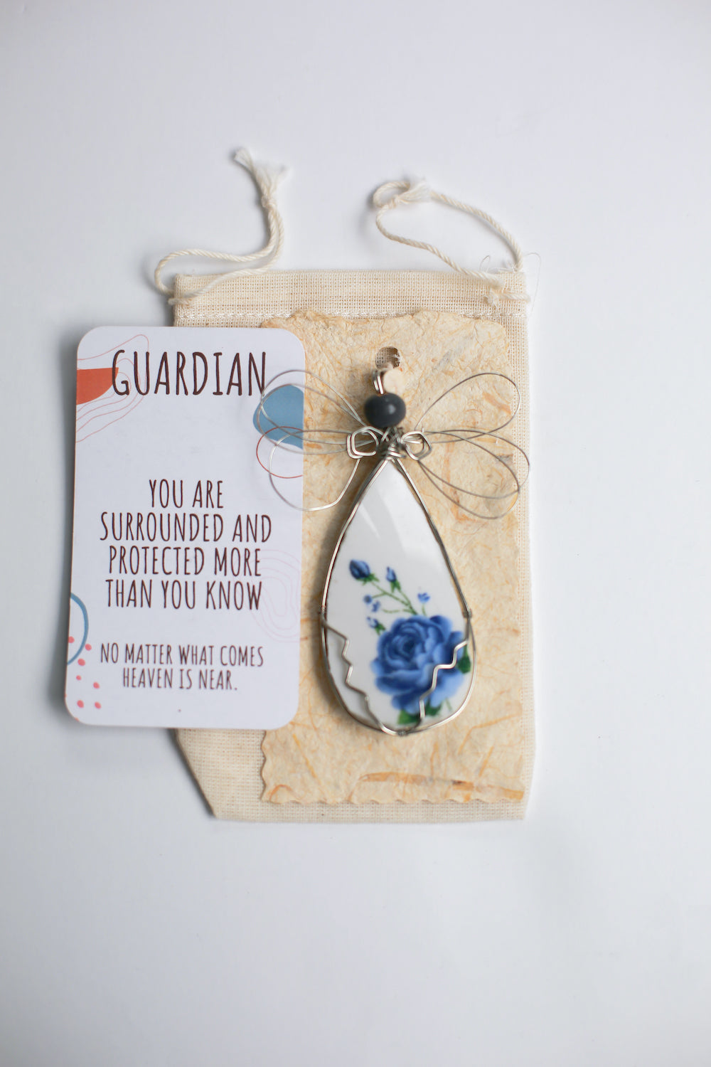Each Angel comes in its own Drawstring Bag with the sentiment stamped on front, Inside you'll get a printed giving card, explaining the significance of the Angels and the Sentiment you choose. Angel is perched on the stamped handmade paper, which you can write on or leave blank. It's a lovely presentation...like giving a big safe hug to someone you love!