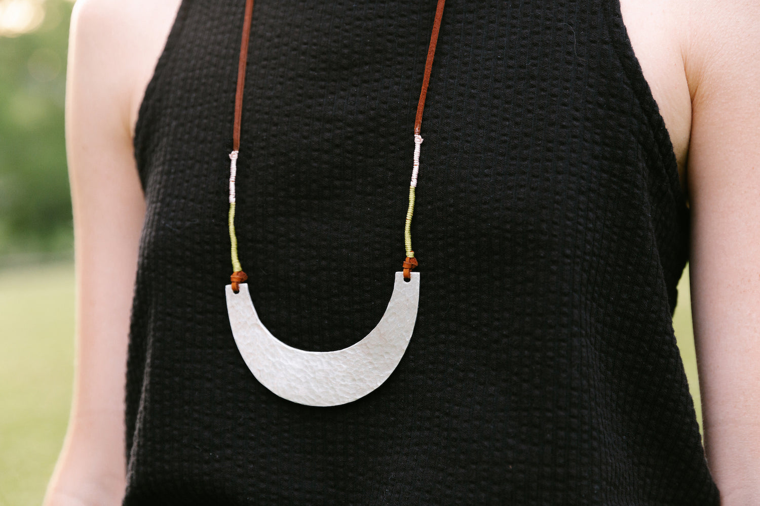 A hammered aluminum U-shaped piece is paired with a leather cord and finished with chartreuse and light pink color-blocking to make this statement piece. Pair it with a solid shirt and your outfit is done!