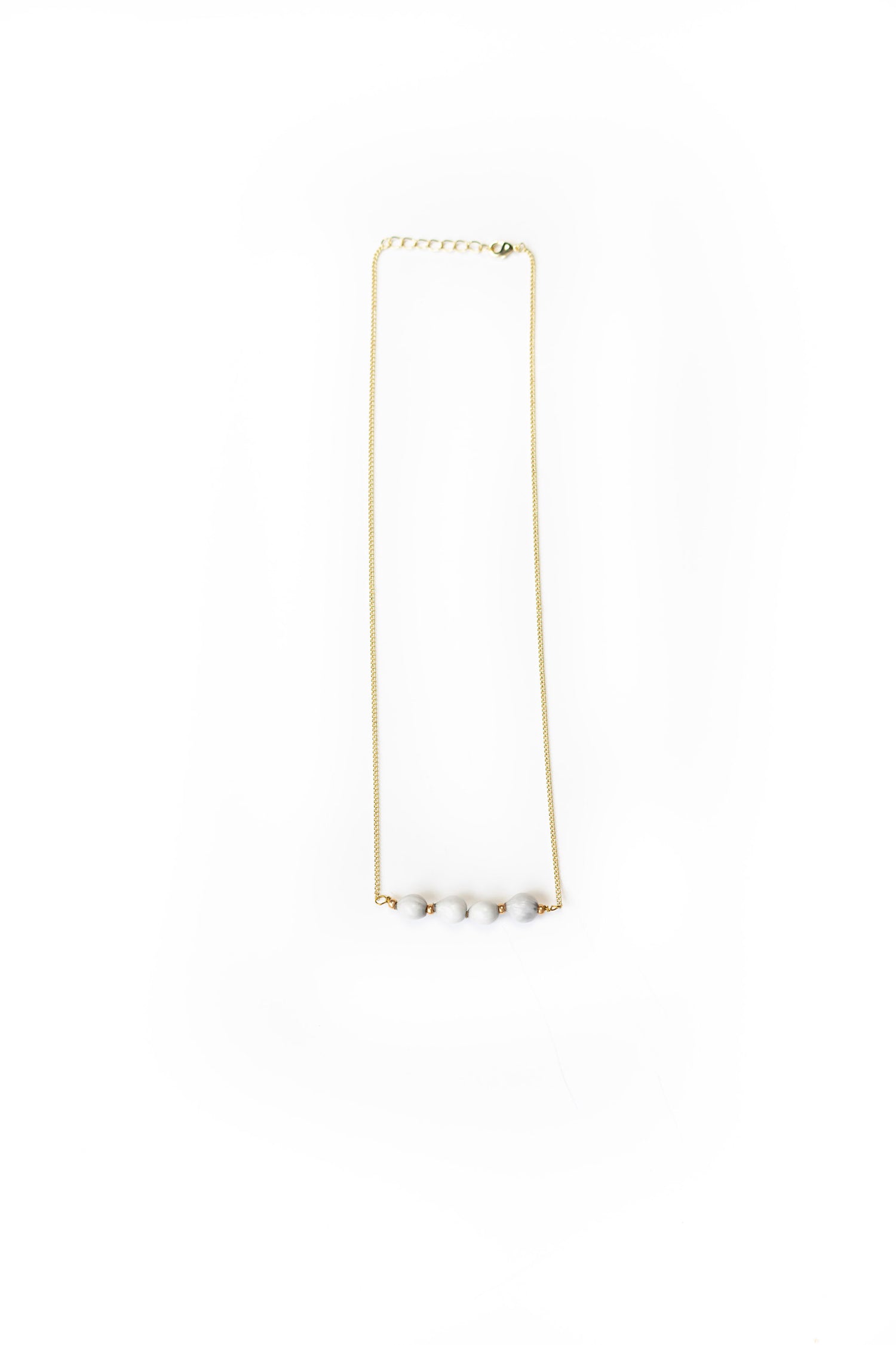 This majok bar necklace works like magic! It can be your new everyday staple; the gold chain with white-gray beads means this can go with literally anything! Hand-dyed, locally-sourced majok seed beads hint at the natural beauty of Haiti, while the short adjustable chain means it can hang at the perfect length with each outfit.